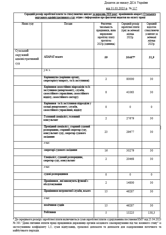 Інформація про середній розмір заробітної плати та стимулюючих виплат працівників апарату суду за вересень 2025 року