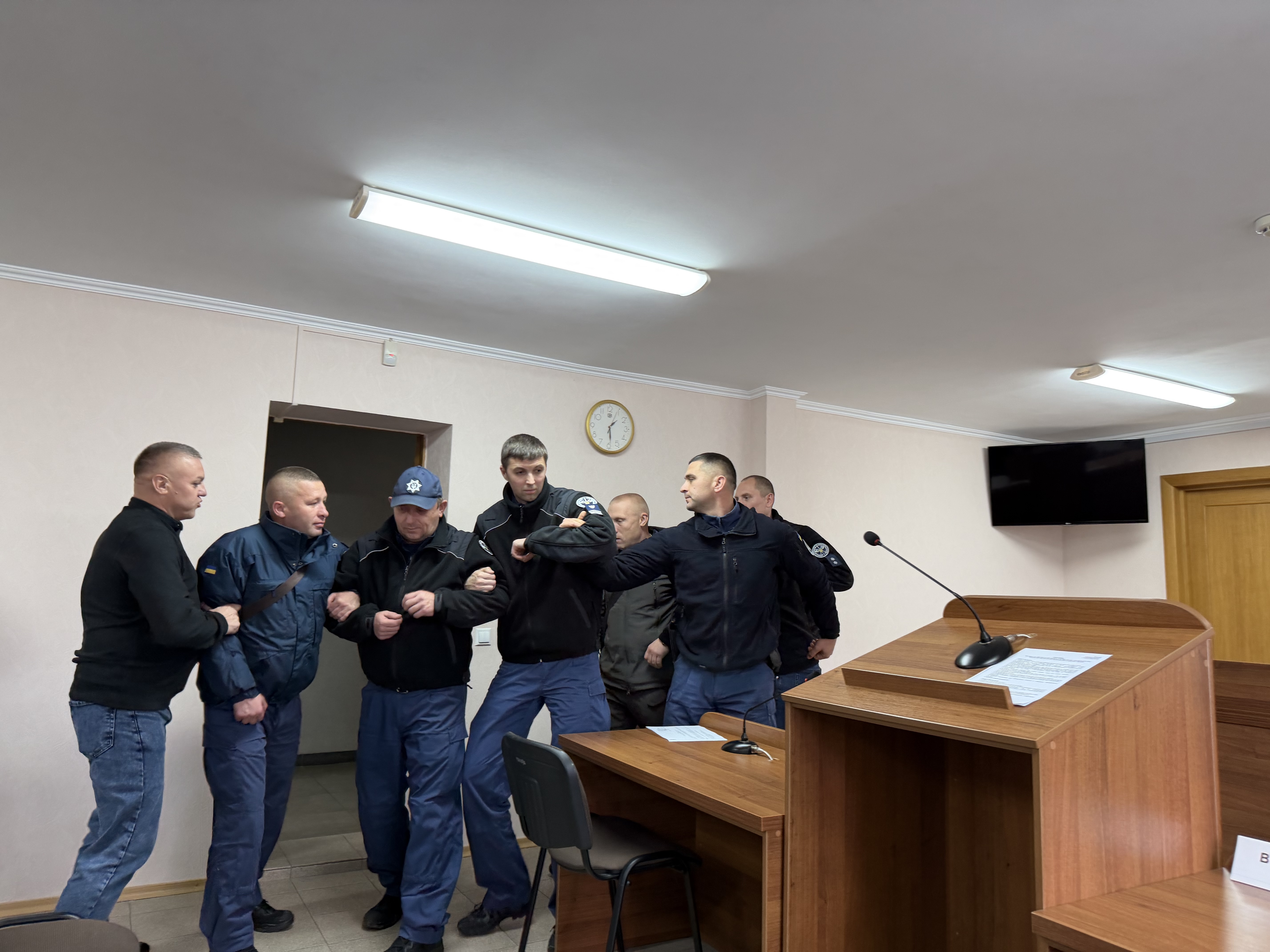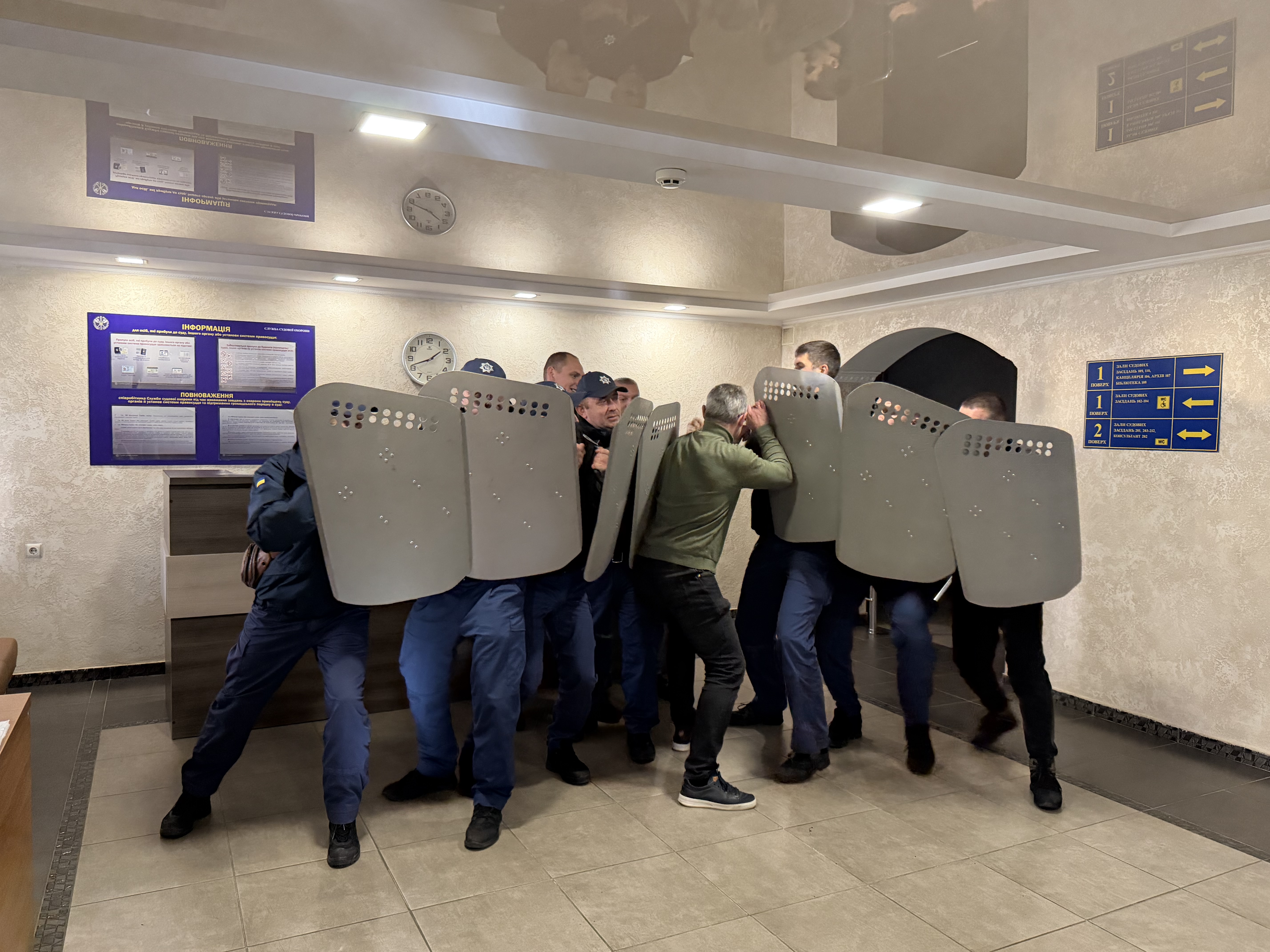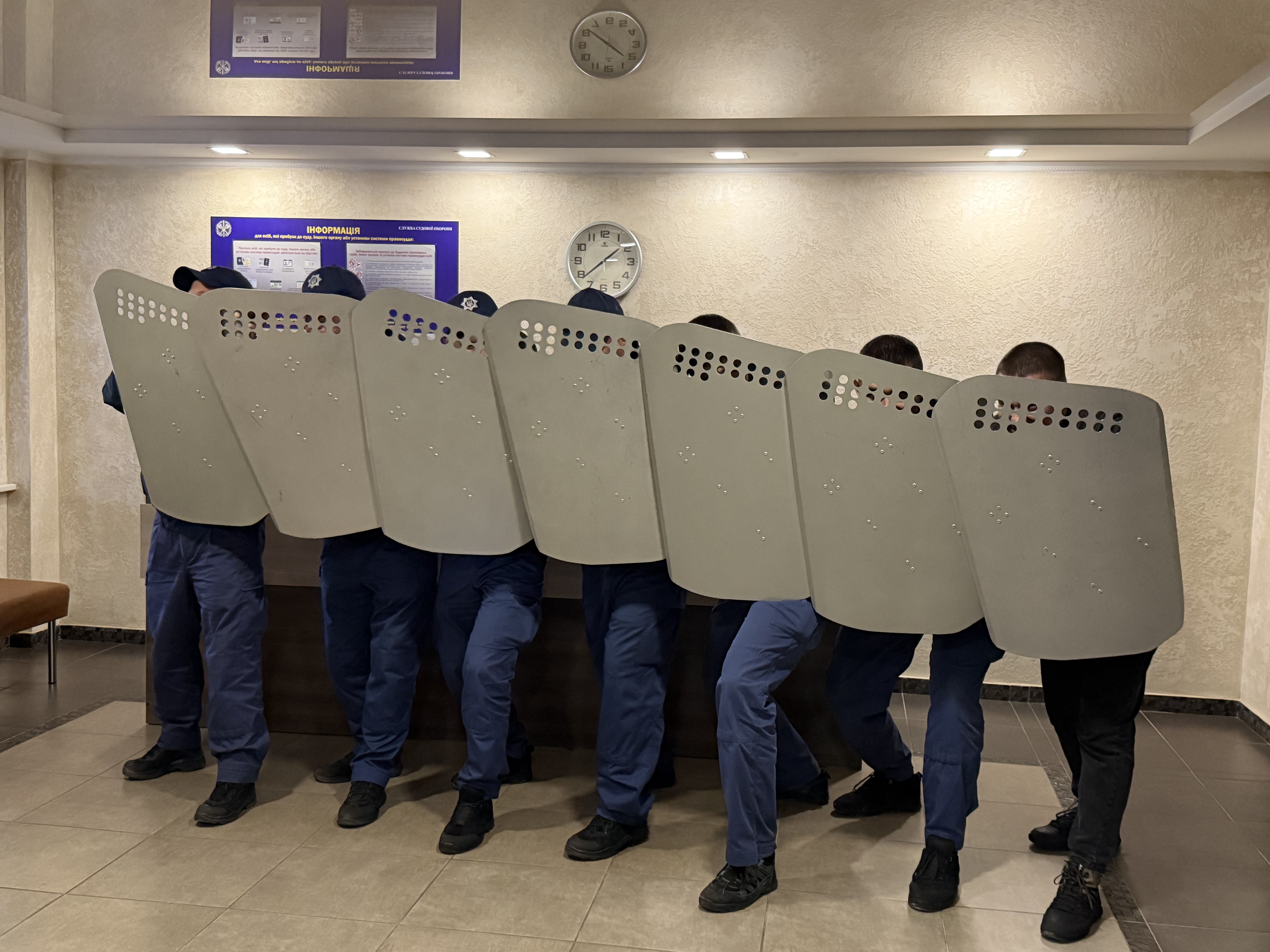 Практична частина складалася з відпрацювання дій у випадку порушення громадського порядку в приміщенні й на території суду. Охоронці Феміди продемонстрували порядок і тактику дій у разі виникнення масових заворушень перед приміщенням суду та під час прояву непокори у залі судового засідання з подальшою передачею порушників громадського порядку правоохоронцям.