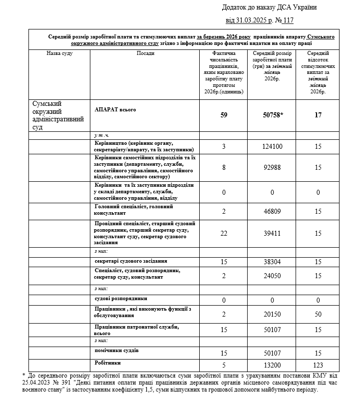 Інформація про середній розмір заробітної плати та стимулюючих виплат працівників апарату суду за березень 2026 року